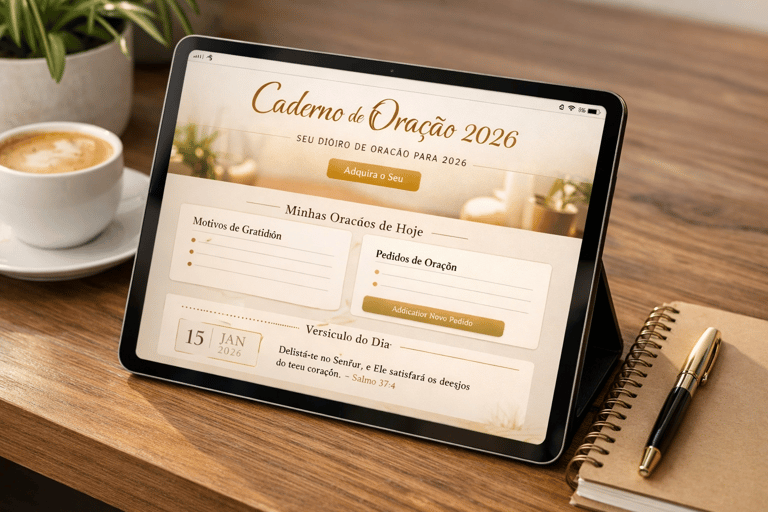 «Lembre-se de que o seu acesso ao Caderno de Oração é vitalício. Continuaremos a adicionar novas ferramentas e guias práticos concebidos para aprofundar a sua intimidade com Deus, eliminar as distrações e transformar a sua comunicação com o Pai numa experiência real e constante.»